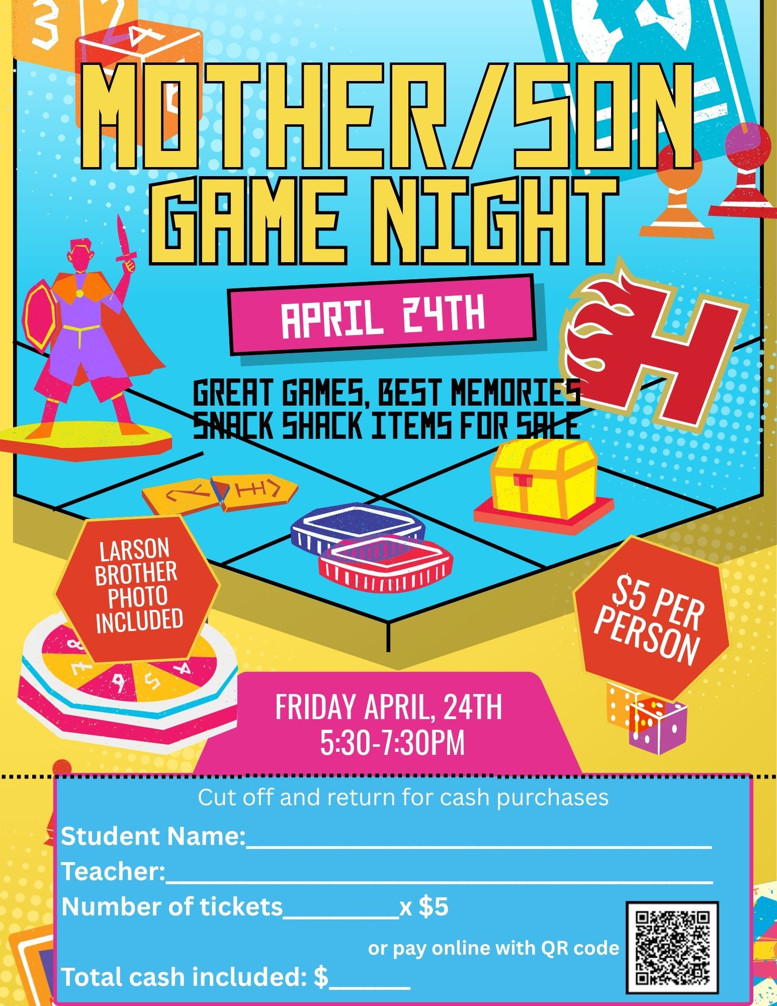 Mother/Son Game Night is next Friday, April 24th from 5:30-7:30pm! Join us for fun outdoor games like Giant Jenga and corn hole, as well as indoor activities and games. You can pay online using THI...